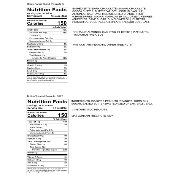 - 14 oz. Black Forest Blend - This healthy yet indulgent mix includes an assortment of perfectly roasted and salted cashews, almonds, hazelnuts, and pistachios; complemented with dried cherries, cranberries, raisins, and rich dark chocolate mini cups.