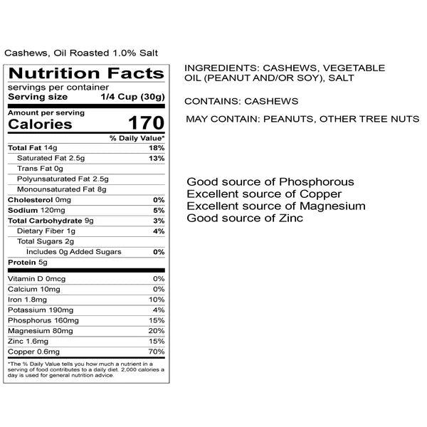 - 14 oz. Roasted & Salted Cashews - These colossal cashews are roasted to a golden perfection and seasoned with a dash of salt.