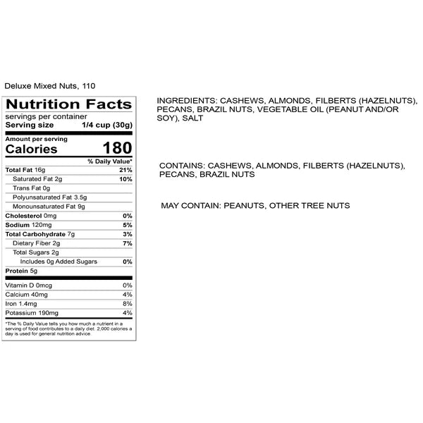 - 14 oz. Roasted & Salted Deluxe Mixed Nuts - This deluxe assortment of nuts is roasted to a golden perfection and seasoned with a dash of salt