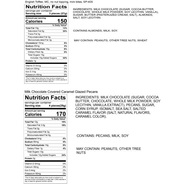 - 14 oz. Milk Chocolate Mini Toffee Bites - Artfully hand crafted, this toffee is portioned into bite sized pieces and enrobed in creamy milk chocolate.