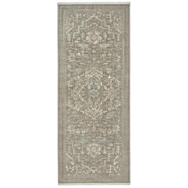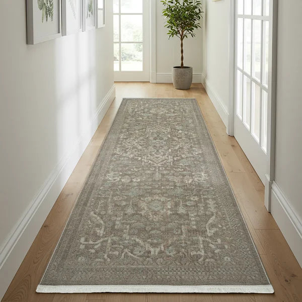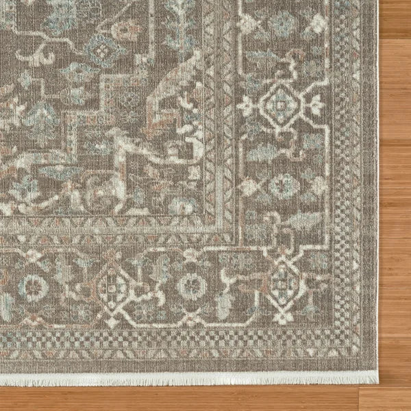 The Berkshire rug collection combines timeless elegance with practical design, making it a perfect addition to any home. Woven in Turkey on precision Wilton power looms, these rugs showcase a mix of taupe and gray base with an ornate medallion and border in layers of blue-gray, soft ivory, and brown. Crafted from high-quality polyester pile yarn, Berkshire rugs offer a plush feel underfoot while maintaining exceptional durability. With a low-profile pile height of .20 in to .24 in. They are ideal for high-traffic areas and won’t interfere with most door swings. Built to withstand everyday wear, Berkshire rugs effortlessly blend style and function, enhancing any décor with lasting beauty.