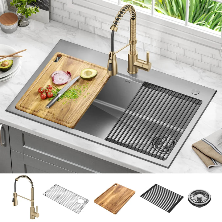 Delta 33” Stainless Steel Workstation Drop In / Undermount Single Bowl Kitchen Sink with Accessories and Semi-Pro Pull-Down Faucet