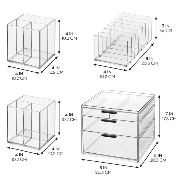 Enjoy a fully customizable cosmetic layout with the iDESIGN 4-Piece Makeup Organizer Set. The vertical format of the cosmetic cube keeps makeup brushes and lip pencils upright and visible, and the palette organizer offers compartmentalized storage for up to seven eyeshadow palettes. The three pull-out drawers keep countertops clutter-free and sleek, pull handles make grabbing what you need quick and convenient. This mix of open and concealed storage provides a space-saving way to corral essentials, and the crystal-clear construction offers unobstructed views, helping to ease busy mornings.
