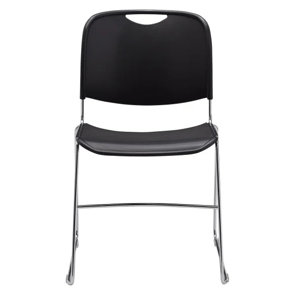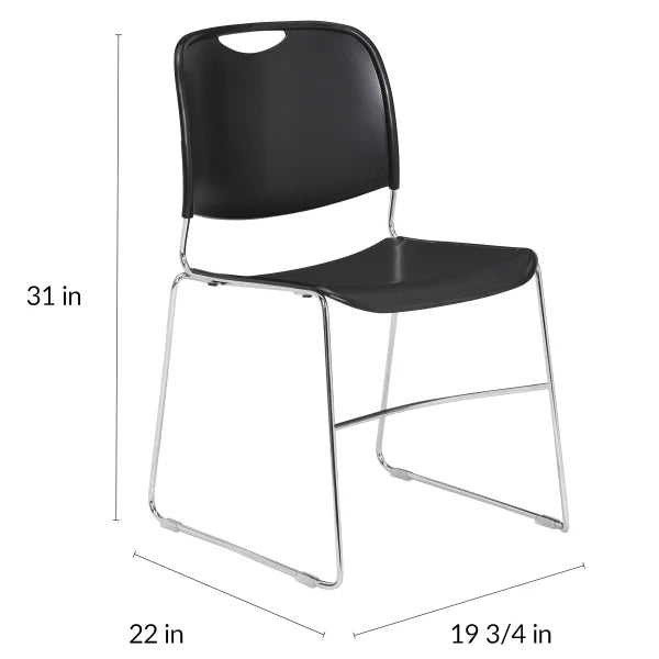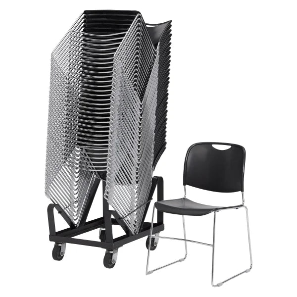 The popular 8500 Series Ultra-Compact stack chair stacks up to 40 units high for quick clean-up and efficient storage in cafeteria-type settings. Each chair has an injection-molded, textured, polypropylene, waterfall-style seat and flexible backrest contoured for maximum ergonomic comfort. The plastic won't fade or scratch and is easy to keep clean. The durable 11mm solid steel-rod chrome-plated frame features under-seat ribbing for reinforced support and prevents cracking. Chair is lightweight, with a built-in backrest handle allowing for easy portability. Sled-style base moves easily over carpeted surfaces while clamping protective glides keep floors unscathed. The Chair Dolly, an 11-gauge steel unit, loads at an angle to securely and impressively hold up to 40 of the NPS 8500 Series stack chairs for easy transport and storage. Features black powder-coated paint finish that will not chip and 4 polyurethane casters (two that swivel) for easy mobility over nearly any surface.