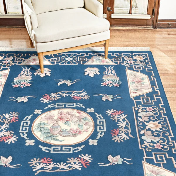 The Pagoda rug is the gold standard of Chinese handmade rug production. The pile is 100% wool, incredibly thick and soft, and finished with hand-carved sculpturing of design elements for dramatic effect. Each of these rugs is created by skilled artisans who use centuries old techniques that are largely unchanged over many generations. While all of the rugs within a collection will feature the same colors and designs, the nature of handmade rugs is such that each piece can have subtle differences which make them, literally, “one of a kind.” This is a unique feature of handmade carpets. These differences range from slight color variations to subtle differences in design and “scale” of the rug. These differences can be due to the hand knotting and yarn dyeing processes. Larger pieces will have more detail in the designs and smaller pieces will have design adjustments so that the pattern is suitable for the size of the rug.