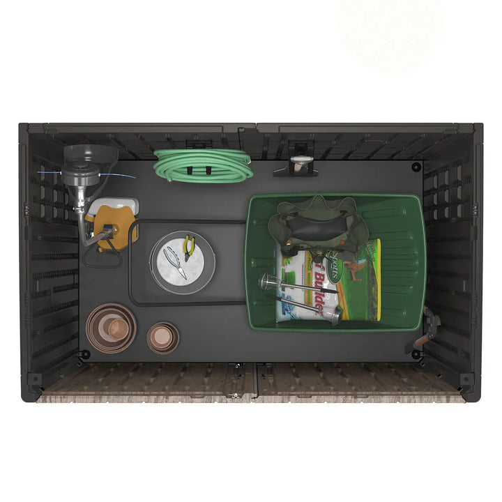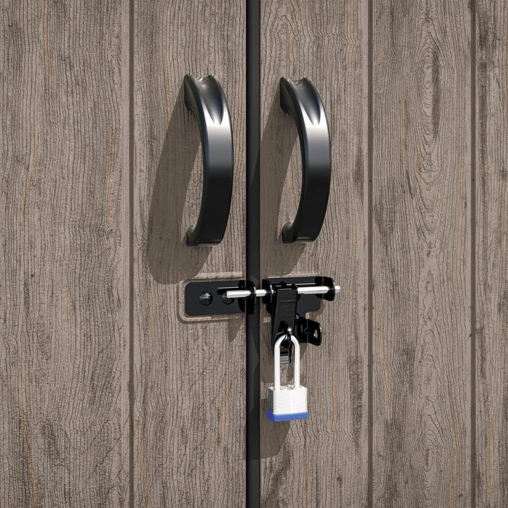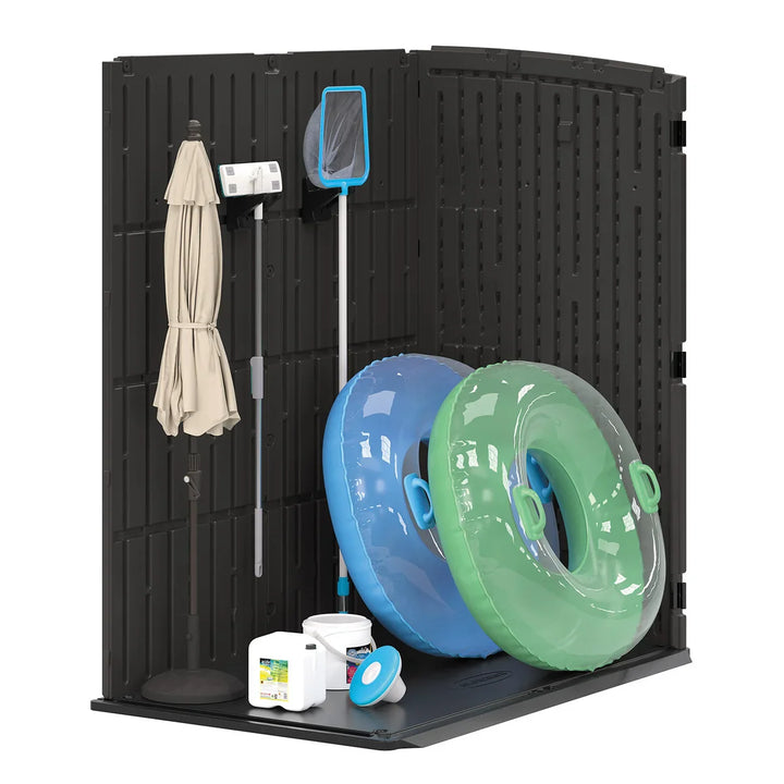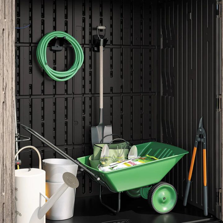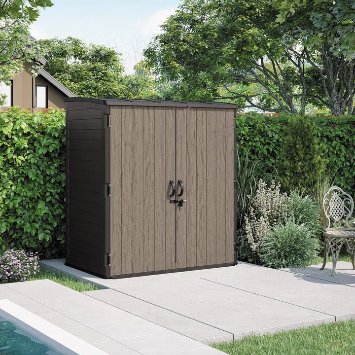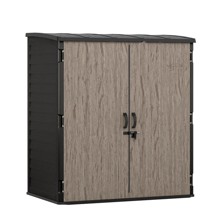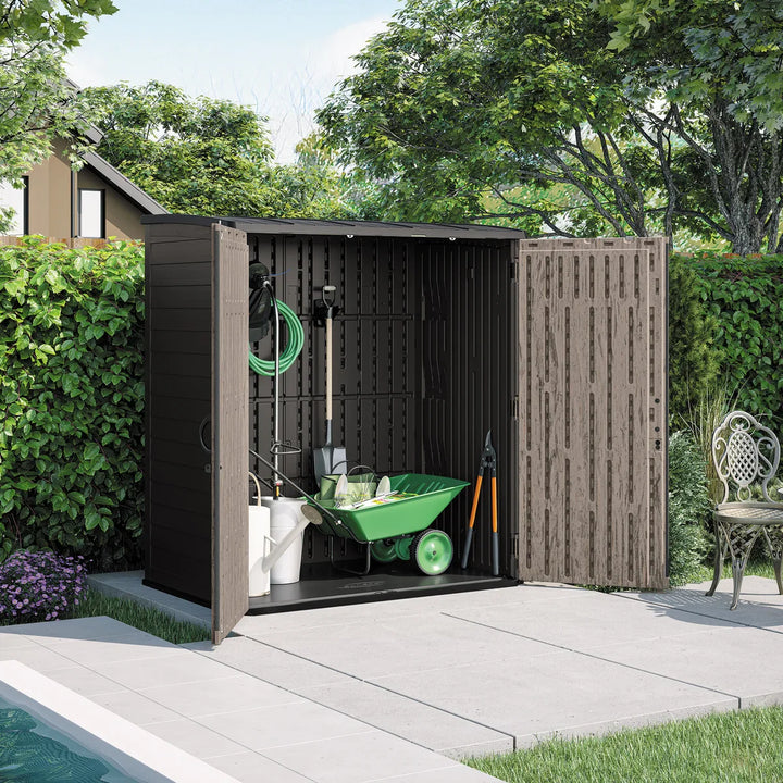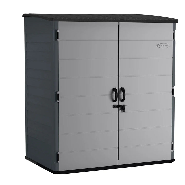 This Extra Large Vertical Shed is perfect for storing a variety of lawn and garden equipment. The slim footprint design fits nicely along a house or garage for when yard space is limited. Double-door entry allows you to access up to 106 cu. ft. of storage space and is equipped with pad-lockable doors for added security (lock not included). Constructed of multi-wall resin panels, this durable shed can hold up to the elements and protect your items all year long.