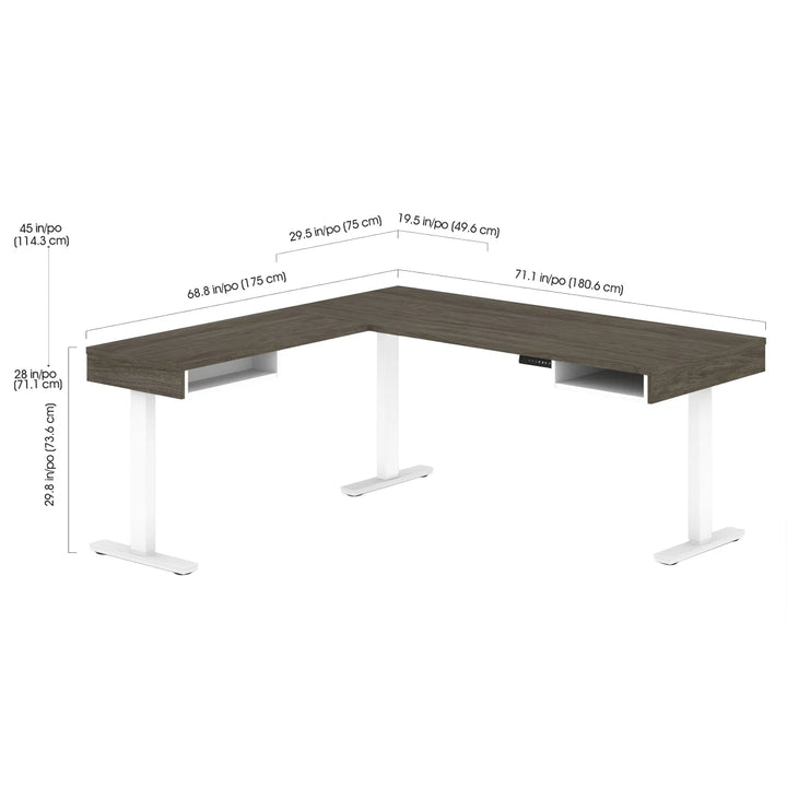 - Free standing L-Shape height adjustable workstation adjustable from 28” to 45”high