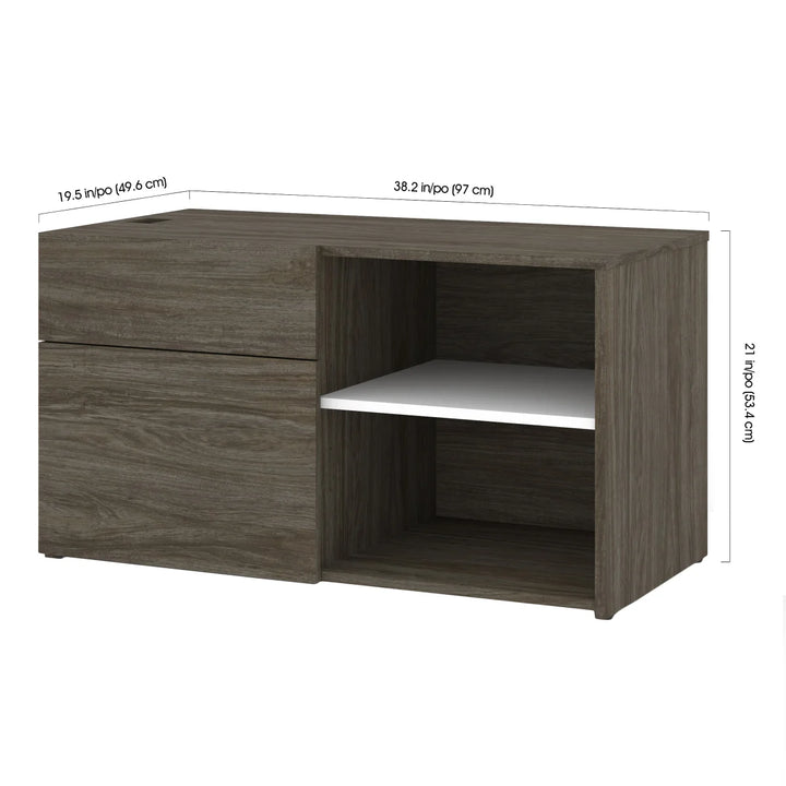 - The credenza provides one utility drawer, one file drawers and one open space.