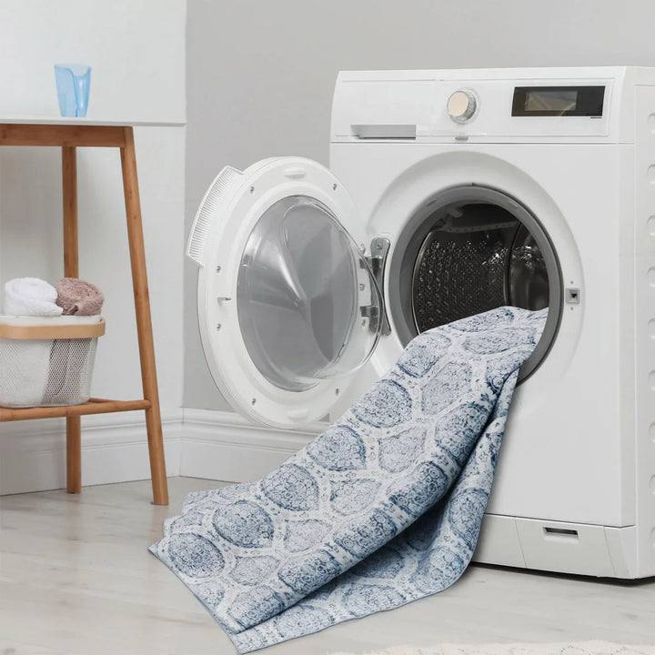 This washable area rug is the perfect addition to elevate your living room, dining room, or family room. This generously sized rug not only provides ample coverage for any of these spaces, but also offers the convenience of easy maintenance. Designed to withstand the demands of daily life, it's made with washable materials, allowing you to keep it looking fresh and clean with minimal effort.
